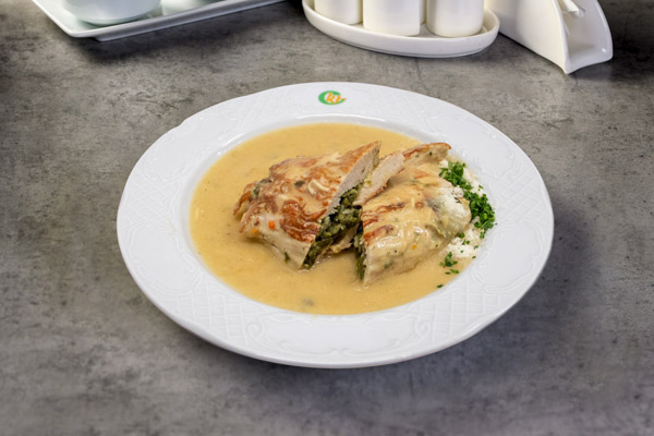 Punjena pureća prsa sa špinatom i gratinirana s umakom od 4 vrste siraStuffed turkey breast with spinach and four-cheese sauce