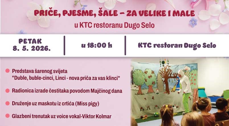 Pridružite nam se u petak 8. svibnja u 18:00h u KTC restoranu Dugo Selo na veselom druženju uz predstavu, radionicu i glazbene hitove za velike i male uz najljepše dječje vokale.